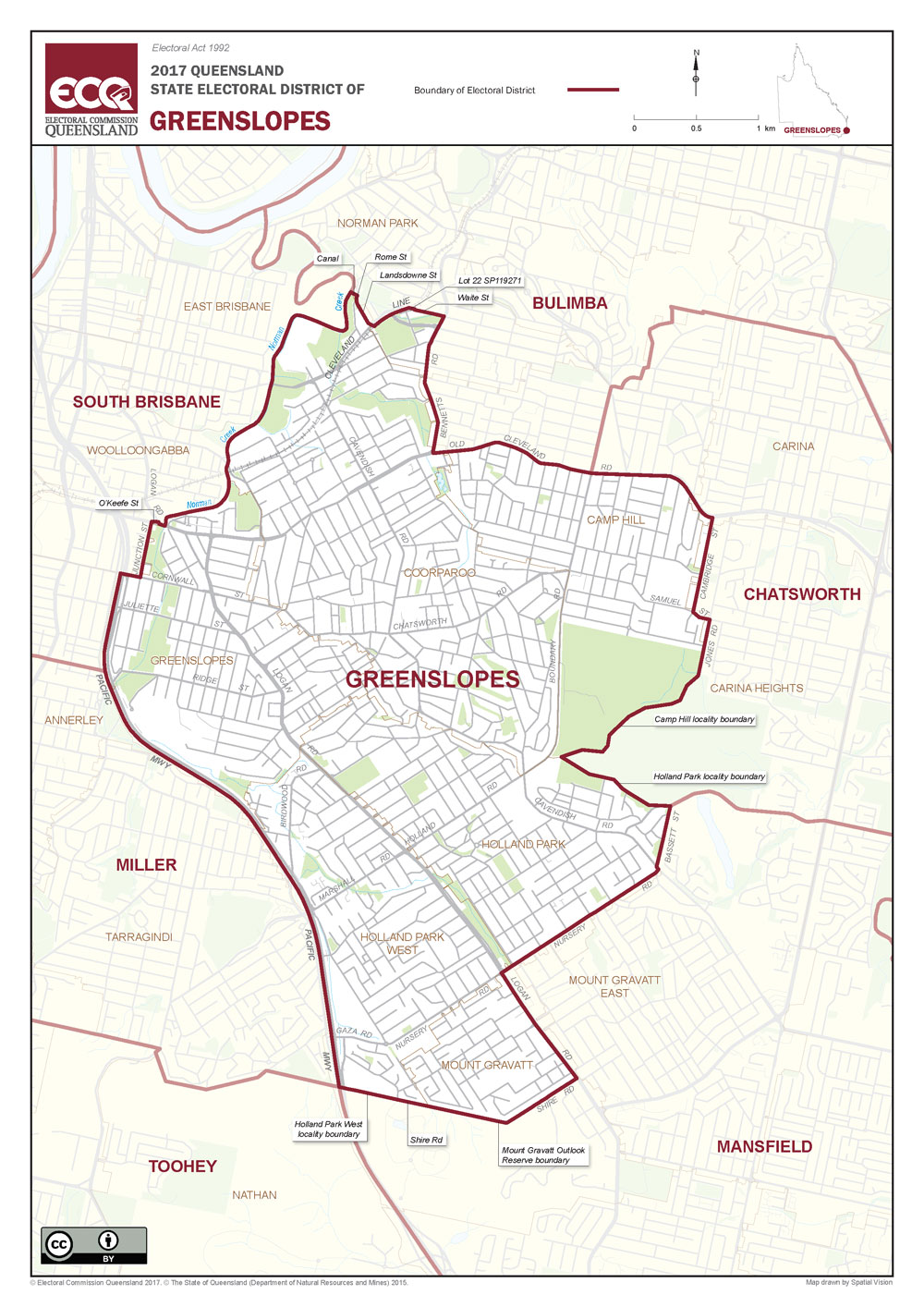 The electorate of Greenslopes lies in inner south-east Brisbane taking in suburbs on either side of Logan and Cavendish Roads. It includes the suburbs of Coorparoo, Greenslopes, Holland Park, Holland Park West, Stones Corner and parts of Camp Hill and Mount Gravatt. Covers 18 square kilometres.